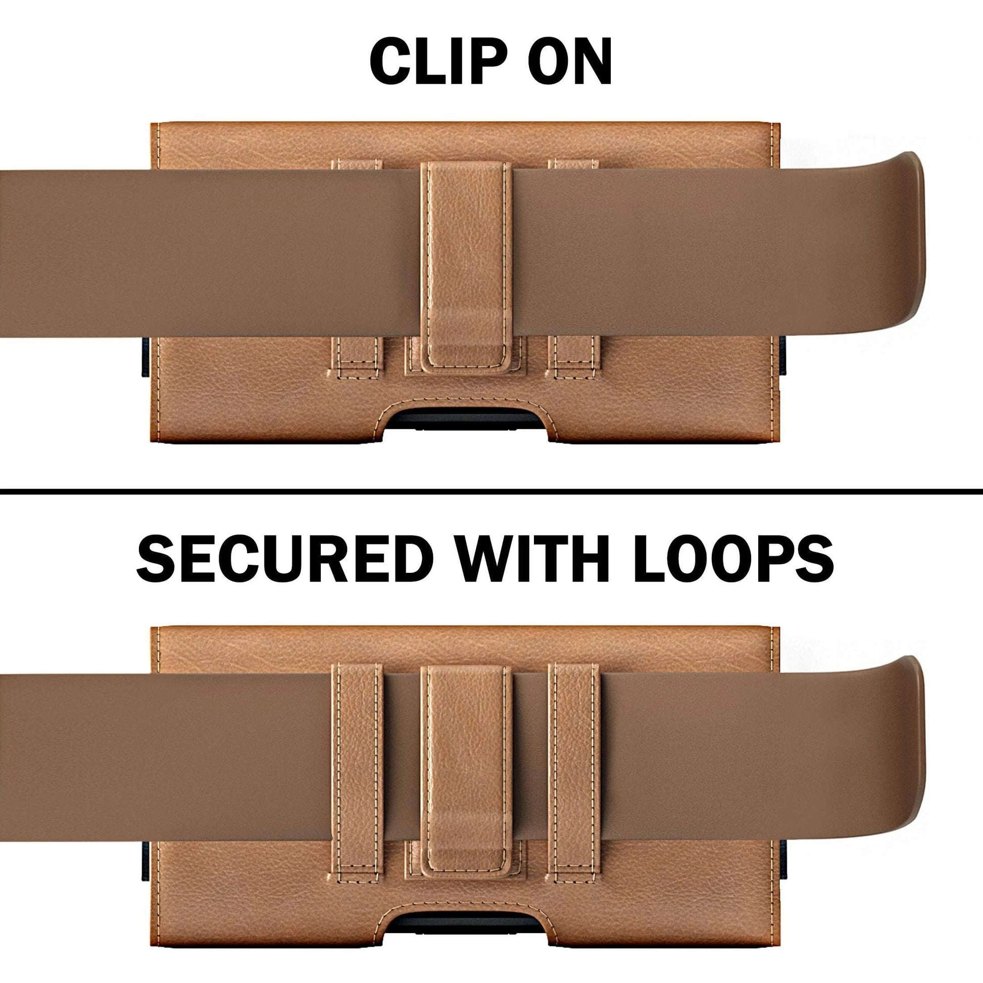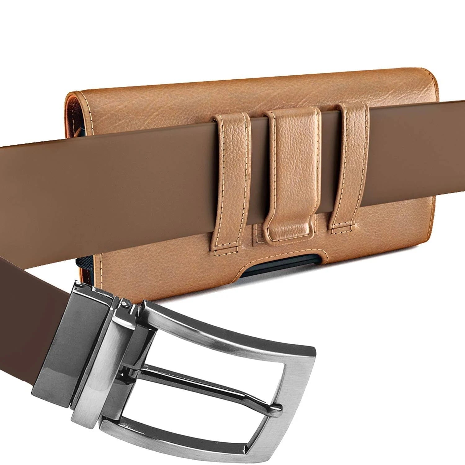 • De-Bin Brown phone belt holder holster with belt clip for iPhone 13 Pro Max, iPhone 12 Pro Max, iPhone 11 Pro Max, iPhone Xs Max, and other large cell phone models with other thin to medium case on