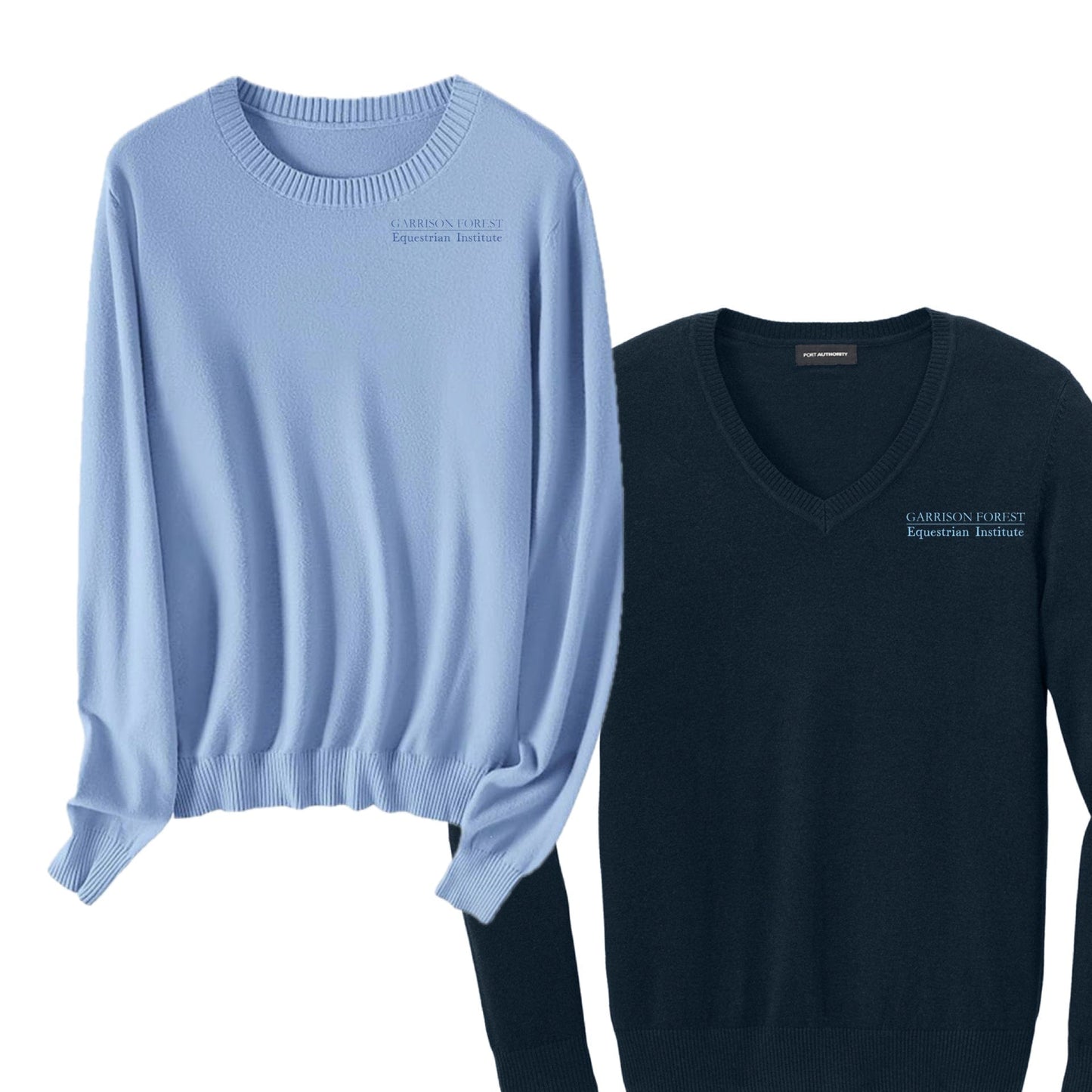 Equestrian Institute Navy and Baby sweaters with left chest embroidery.