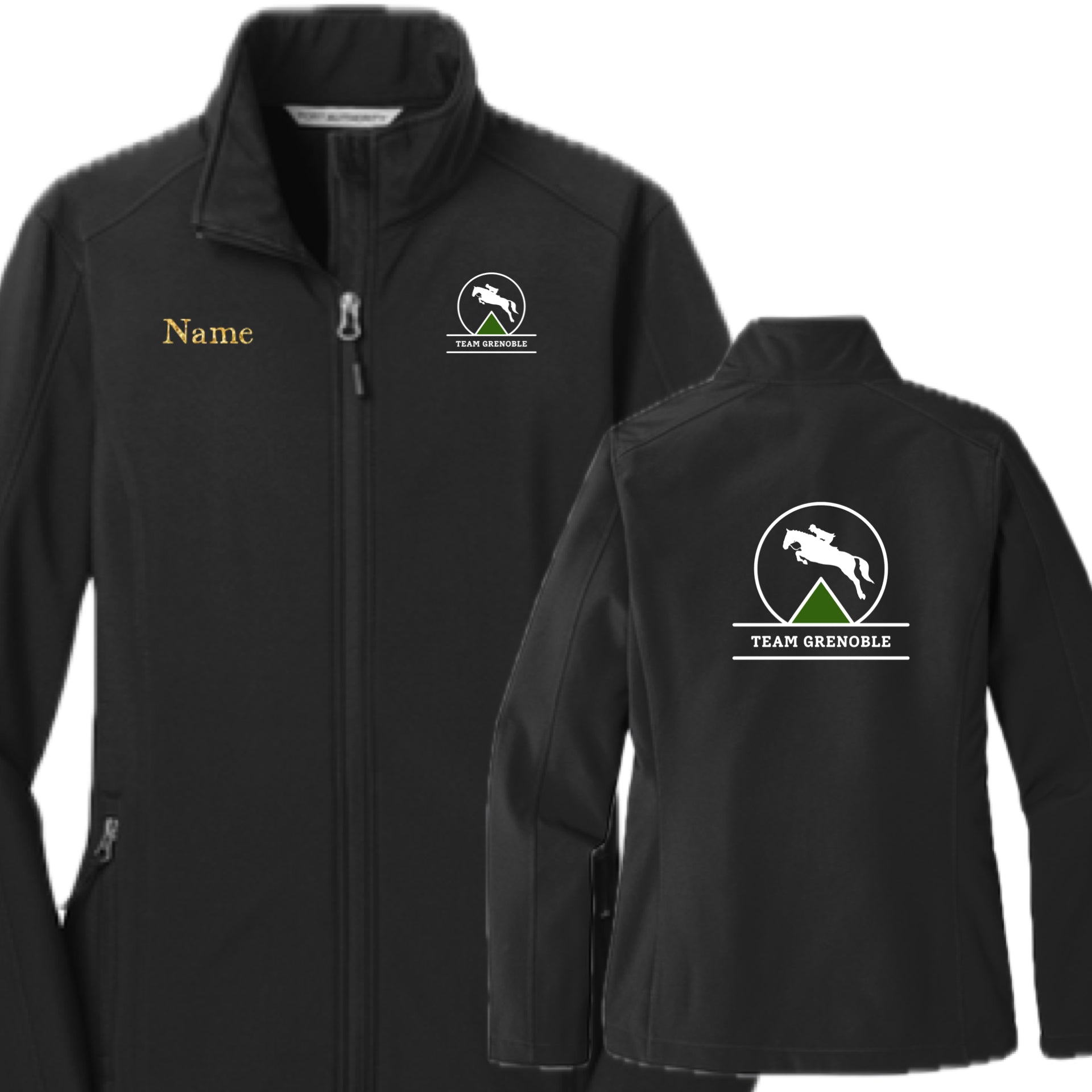 Shell jacket in black with left chest and big back embroidered logo. Optional right chest name in gold metallic thread. Please put the name in the notes at check out or it will be left blank.